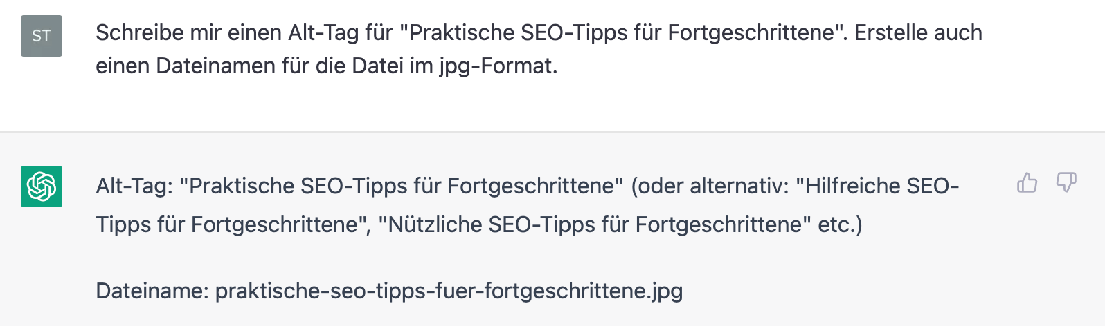 Mithilfe von ChatGPT können Sie mühelos relevante und aussagekräftige Alt-Tags und Dateinamen für Ihre Bilder generieren. Die Verwendung von Keywords in den Alt-Tags und Dateinamen sorgt dafür, dass die Bilder besser von Suchmaschinen indexiert werden und somit in den Suchergebnissen höher ranken.