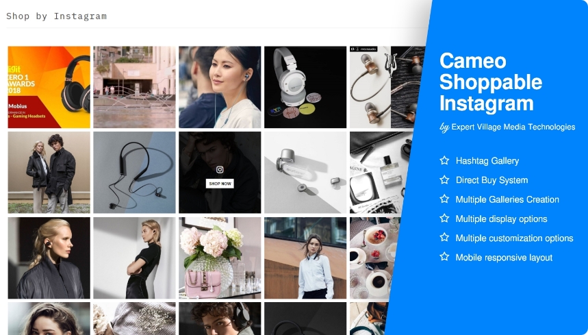 Cameo ermöglicht ebenfalls das Einbinden eines shoppable Instagram-Feeds auf der eigenen Website. Zusätzlich kann nach Hashtag oder dem getaggten Produkt gesucht werden. Für 19,99 Dollar pro Monat haben Sie außerdem Zugriff auf Analysedaten zur Performancemessung.