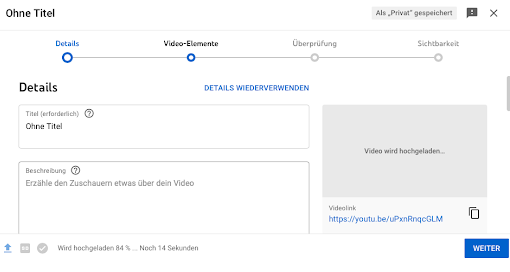 Somit erreichen Sie ein noch größeres Publikum. Um Ihren Videos Untertitel hinzuzufügen, gehen Sie beim Upload auf den Reiter „Video-Elemente“ und wählen Sie „Untertitel hinzufügen“ aus.